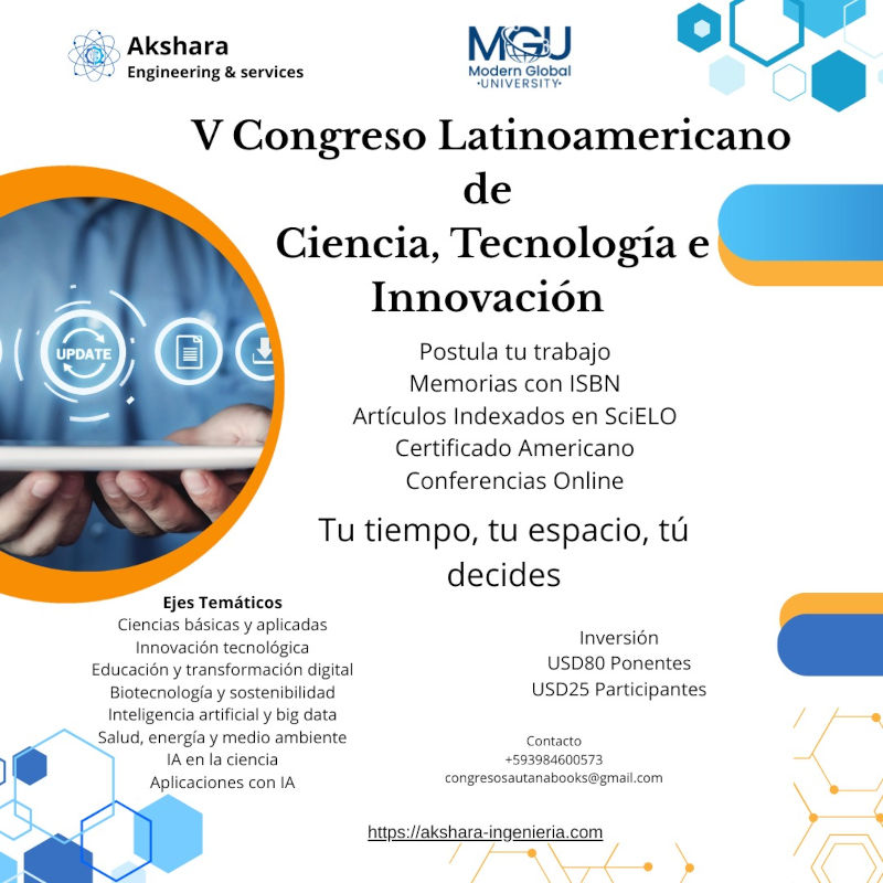 El V Congreso de Ciencia, Tecnología e Innovación cuenta con el auspicio de la Modern Global University (MGU - Estados Unidos), AutanaBooks y Akshara Ingeniería, fortaleciendo su proyección internacional y fomentando la cooperación científica entre América e Iberoamérica.
